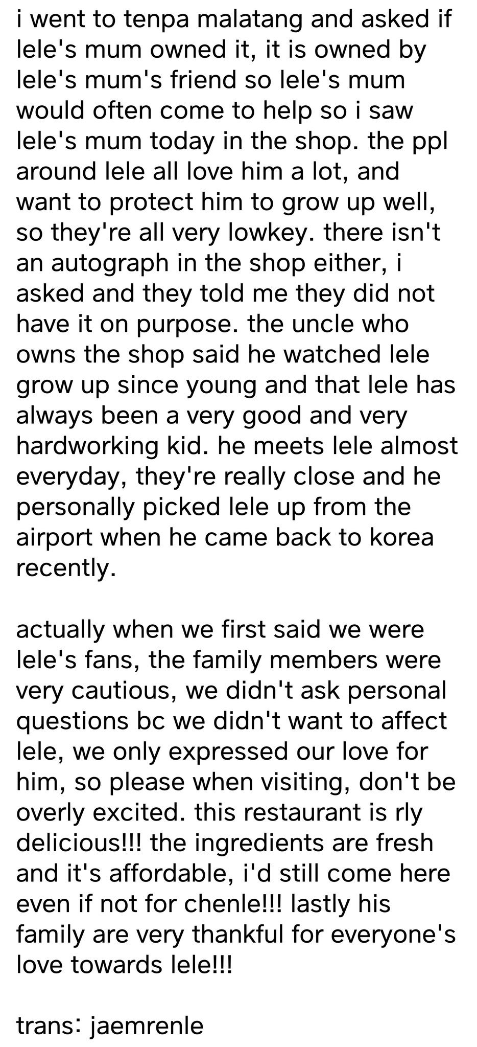 [trans] the malatang restaurant that chenle, jeno, jaemin and jisung were spotted eating at is owned by chenle’s mum’s friend so chenle’s mum often goes to help out 😭